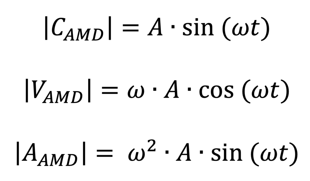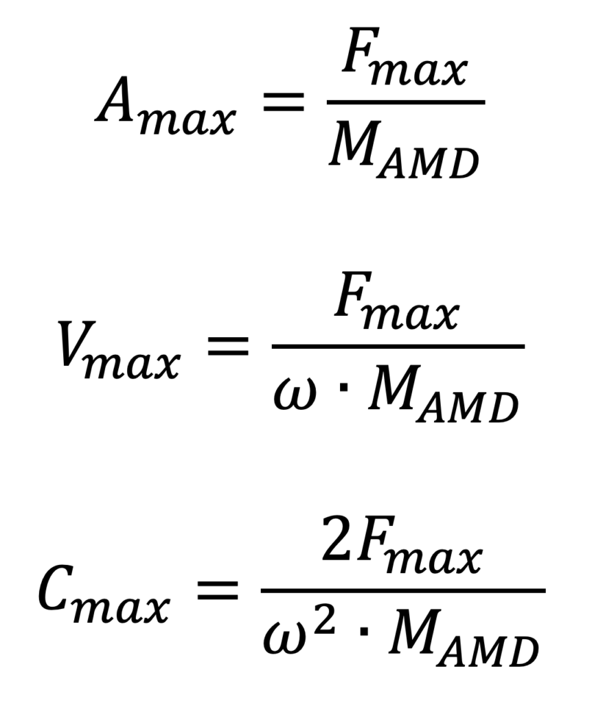 Per meglio chiarire questi concetti, si consideri un semplice oscillatore a un grado di libertà, soggetto a un moto armonico monodirezionale, sul quale sia installato un AMD generico in sommità. Al fine di massimizzare l’efficacia del controllo, la massa mobile dovrà oscillare alla stessa frequenza dell’oscillatore, seguendo le equazioni caratteristiche del moto armonico. Trascurando, in prima approssimazione la presenza di un angolo di fase e considerando unicamente i moduli delle grandezze coinvolte, si può procedere a quantificare le seguenti grandezze cinematiche: