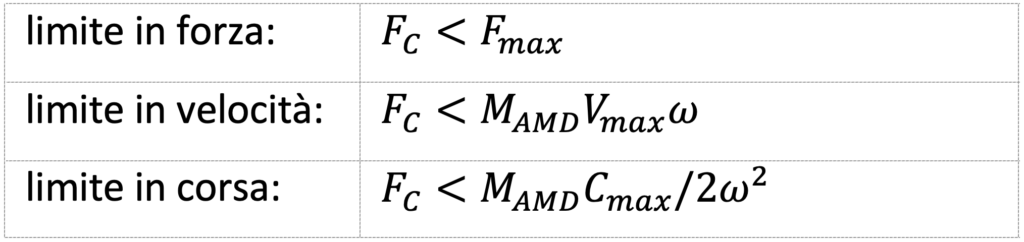 I parametri relativi alla massa mobile MAMD e alla corsa C del sistema Active Mass Damper (AMD) vengono trattati congiuntamente, poiché strettamente interconnessi. Per una comprensione completa del problema, è necessario considerare anche la velocità della massa mobile e la forza di controllo massima erogabile.