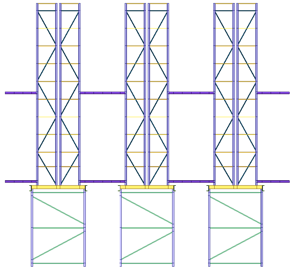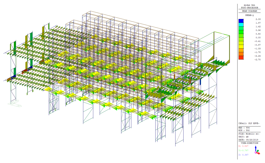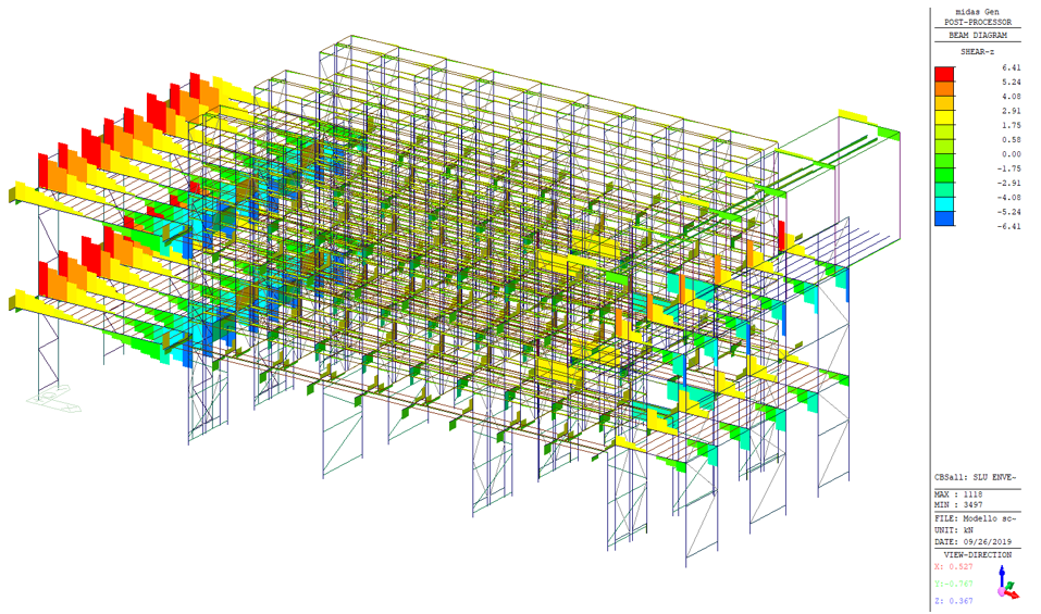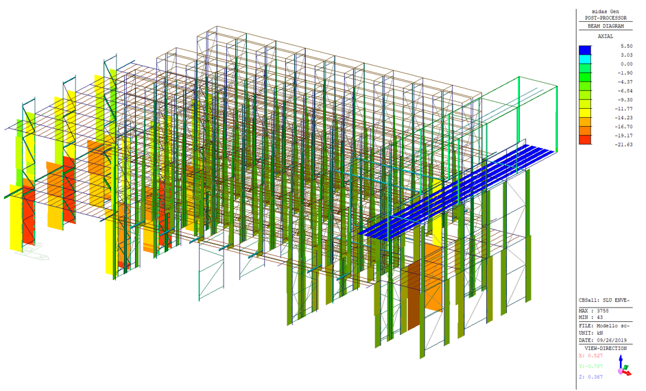 Non sono stati applicati carichi derivanti ad azioni atmosferiche in quanto la scaffalatura risulta essere ubicata all’interno di un fabbricato industriale. Inoltre non sono stati analizzati condizioni sismiche, ciò è dovuta dall’esigenza della committenza di avere una dichiarazione statica delle strutture a seguito di alcuni interventi. Si possono notare varie condizioni di carico delle vie di corsa di due paranchi. Di seguito si riportano gli inviluppi dei diagrammi delle sollecitazioni derivanti dalle azioni combinate come viste in precedenza secondo le prescrizioni normative. Seguiranno gli inviluppi dei diagrammi inerenti alle combinazioni di inviluppo SLU statiche dell’intero modello di calcolo strutturale e delle colonne oggetto di verifica di portata.