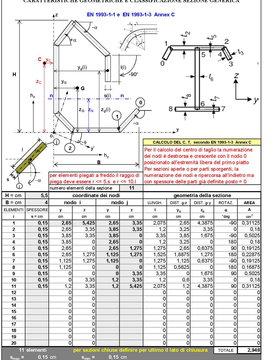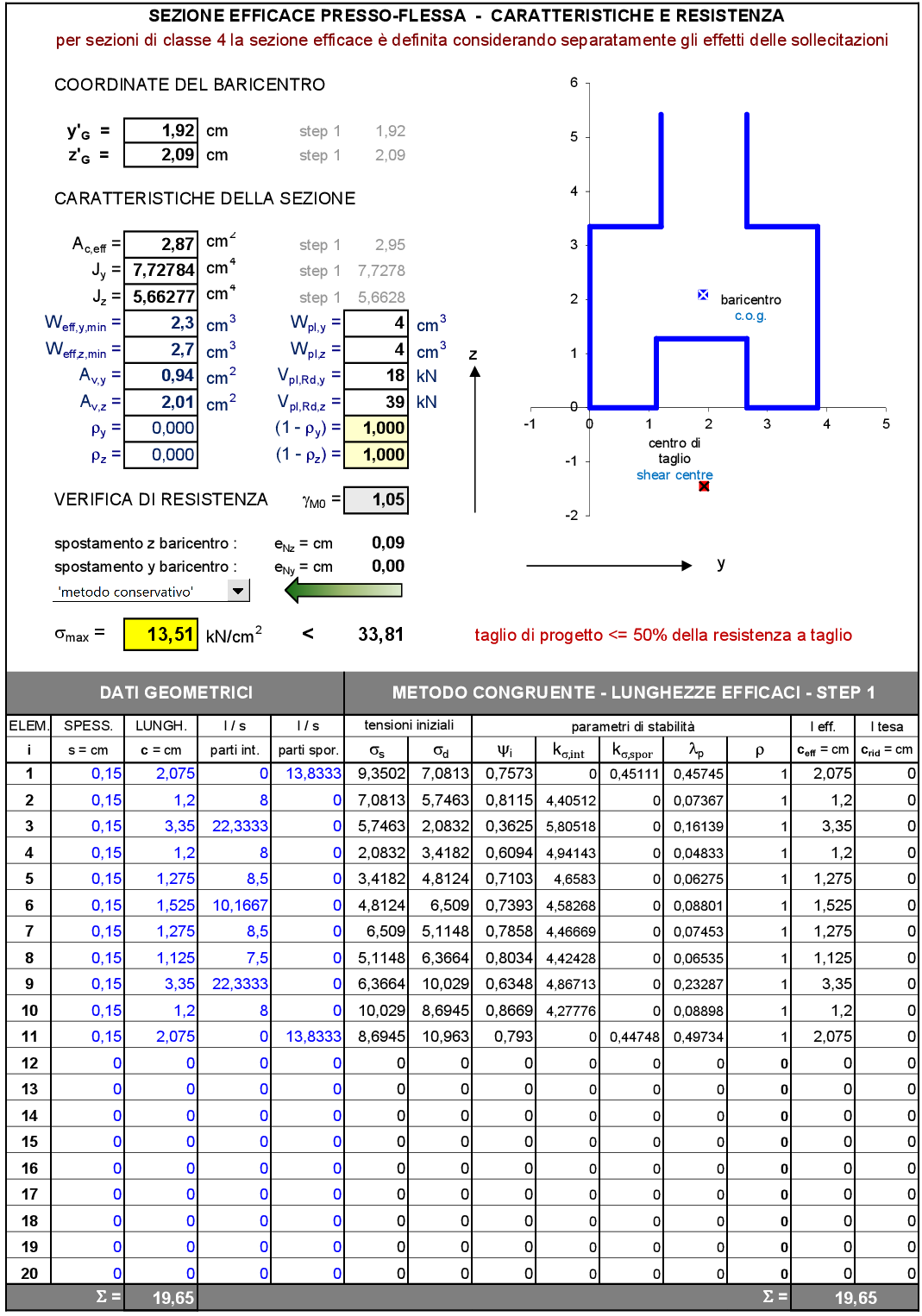 La verifica delle sezioni sottili aperte, come precedentemente descritto, risulta molto complessa ad alta onerosità computazionale. Per l’analisi dell’instabilità locale i profilati a freddo si considerano composti da un insieme di lastre piane mutuamente collegate lungo i bordi comuni, per semplicità si assume che i bordi siano semplici appoggi, trascurando il possibile vincolo mutuo alla rotazione in presenza di irrigidimenti di bordo o intermedi occorre verificare l’efficacia dell’irrigidimento, cioè la sua capacità di impedire spostamenti. Per l’Eurocodice 3 la larghezza geometrica è indicata col simbolo bp ed è misurata dal punto medio del raccordo d’angolo. 1) La classificazione delle sezioni sottili in acciaio segue un metodo che è solo in parte dipendente dallo stato effettivo di sollecitazione attribuendo alla fibra esterna più compressa la tensione di snervamento. Elementi della sezione (anime, flange, irrigidimenti…) definiti di classe 4 non sono necessariamente ridotti poiché lo stato tensionale effettivo è sicuramente diverso da quello “costruito” per la classificazione a differenza delle sezioni in alluminio. 2) I valori limite del rapporto larghezza/spessore (d/t) individuano “zone” entro le quali la classe viene univocamente definita. Analogo discorso vale per le parti presso-flesse della sezione per le quali la classe 3 è ottenuta se il rapporto d/t è compreso tra il valore limite della classe 2 ottenuto considerando un comportamento plastico (d/t funzione di α) e il valore limite della classe 3 ottenuto considerando un comportamento elastico (d/t funzione di ψ). La classe 4 è attribuita a quelle parti della sezione il cui rapporto d/t è maggiore del rapporto limite della classe 3. È evidente che il passaggio da una classe all’altra non è lineare col rapporto limite d/t e quindi la discrezionalità del metodo non giustifica l’utilizzo di sofisticate analisi per definire il valore più “esatto” di tale rapporto. 3) Una stessa sezione può essere diversamente sollecitata in base alla combinazione dei carichi considerata per quell’elemento strutturale e pertanto si può avere prevalenza di momento flettente in una direzione piuttosto che in un’altra con conseguente diversa situazione tensionale in una stessa parte della sezione. Per sezioni generiche di classe 4 viene quindi esposto un criterio di calcolo della sezione efficace basato sul metodo iterativo che, considerando la sovrapposizione degli effetti, definisce per ogni elemento della sezione lo stato tensionale iniziale e quindi un valore ε = [235 / σcom,Ed] 0,5 che varia al variare della sezione efficace definita in passi sequenziali fino alla convergenza del valore massimo della tensione di compressione (σcom,Ed). Per comprendere meglio il metodo proposto si farà riferimento al programma realizzato a cura dell’Ing. Leone Domenico. Analisi FEM di dettaglio inerente al portale principale controventato. Il modello FEM fa riferimento alla verifica del portale in giallo in foto. Nelle immagini di cui sopra, si riportano i tralicciati portanti degli scaffali. Di seguito si riporta la verifica strutturale della colonna a sezione sottile aperta maggiormente sollecitata allo SLU.