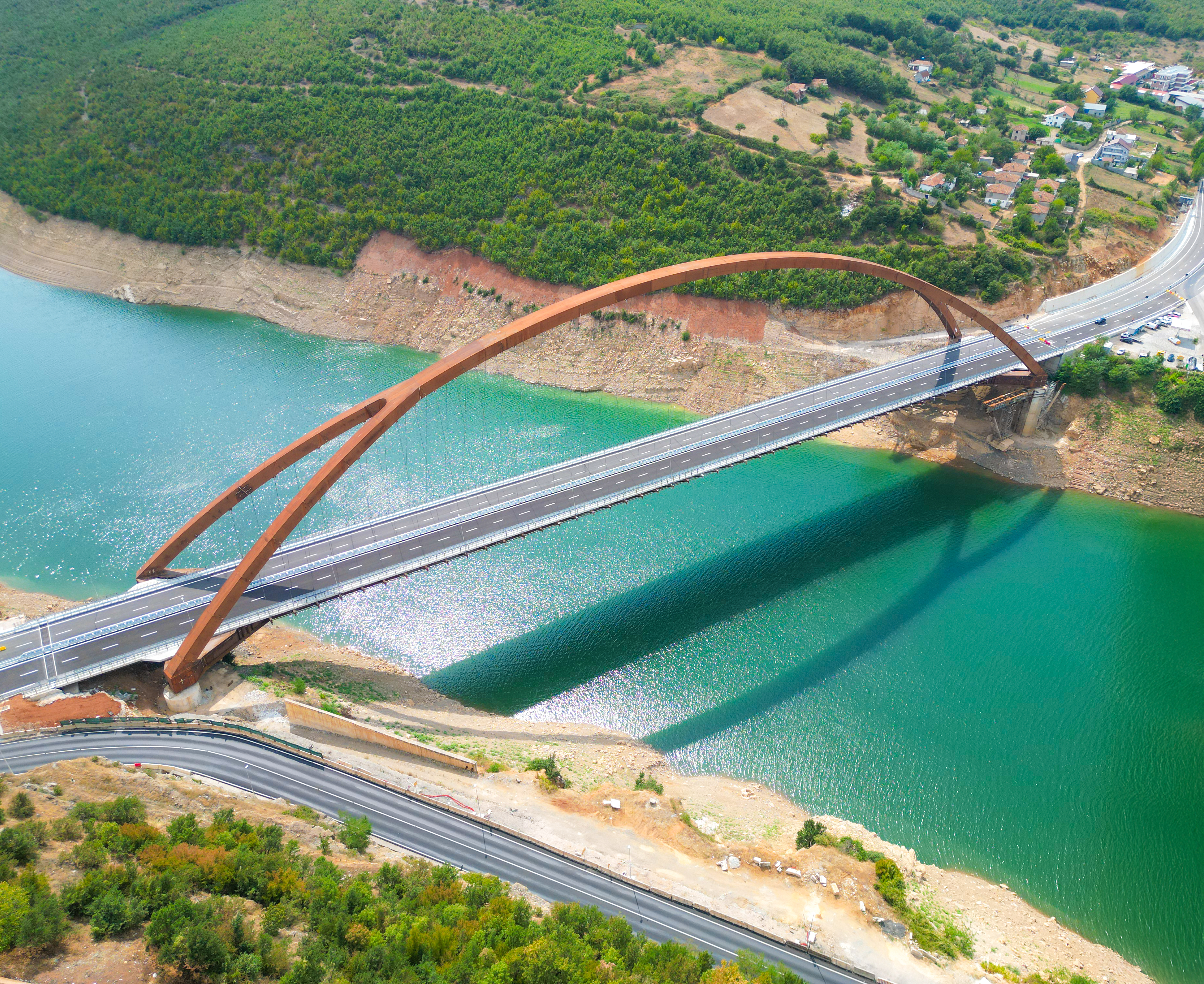 Il New Drini Bridge, nel nord-est dell’Albania, è un ponte ad arco a spinta eliminata con catena mista a travi di acciaio, dalles e soletta in calcestruzzo armato, di luce tra gli appoggi di 271m, caratteristico per l’arco unico centrale e biforcuto ai terzi, fino alle imposte. Il ponte, il più grande mai realizzato in Albania, un paese che dal letargo economico dell’economia di piano, si è risvegliato brillantemente grazie all’economia di mercato, è stato concepito per sostituire un precedente manufatto in calcestruzzo, ed è importante perché permette, con l’attraversamento del lago di Fierza, il collegamento del sud del paese con le vie verso l’Europa dell’Est.